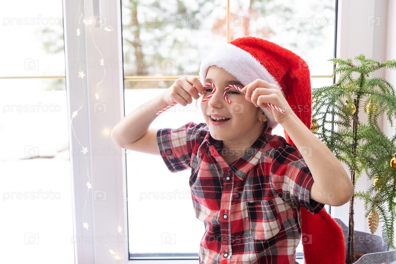 Девушка в шапке Санты сидит на подоконнике дома возле рождественской елки и прикладывает леденец к глазам, как очки. Ребенок веселится и корчит рожицы, ожидая Рождества и Нового года