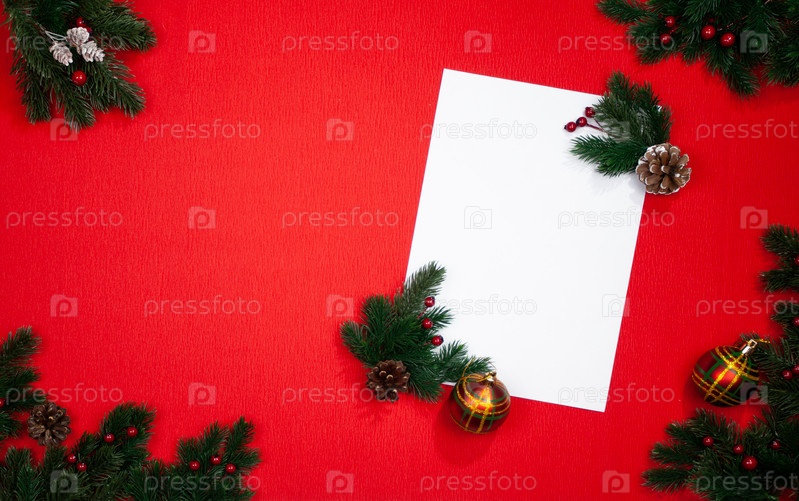 Новогодняя открытка. Зеленые еловые ветки и украшения на красном фоне