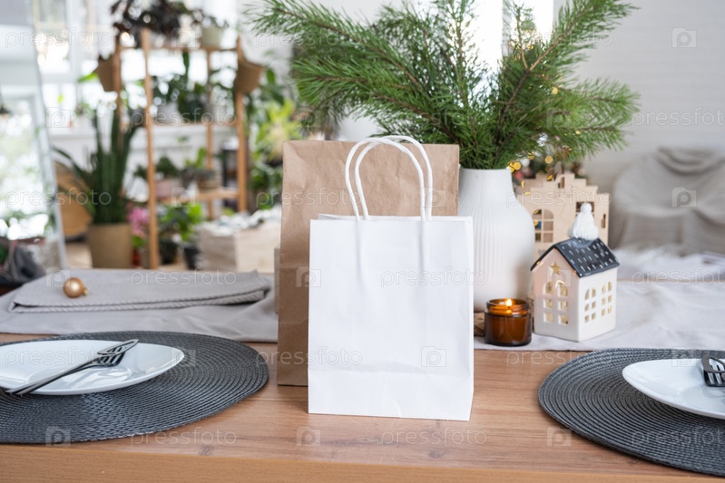 Макет бумажных пакетов стоит на кухонном столе, украшенном к Рождеству. Покупки и подарки, подарки и готовые блюда доставлены и приготовлены к Новому году