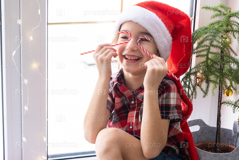 Девушка в шапке Санты сидит на подоконнике дома возле рождественской елки и прикладывает леденец к глазам, как очки. Ребенок веселится и корчит рожицы, ожидая Рождества и Нового года