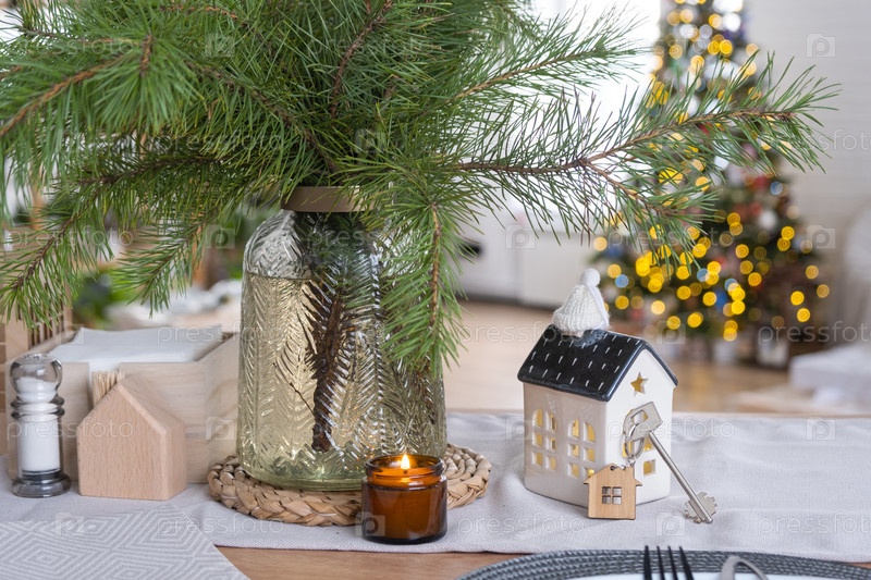 Ключ от дома в уютном доме с рождественским декором на столе праздничной кухни. Подарок на Новый год. Строительство, дизайн, проект, переезд в новый дом, ипотека, аренда и покупка недвижимости