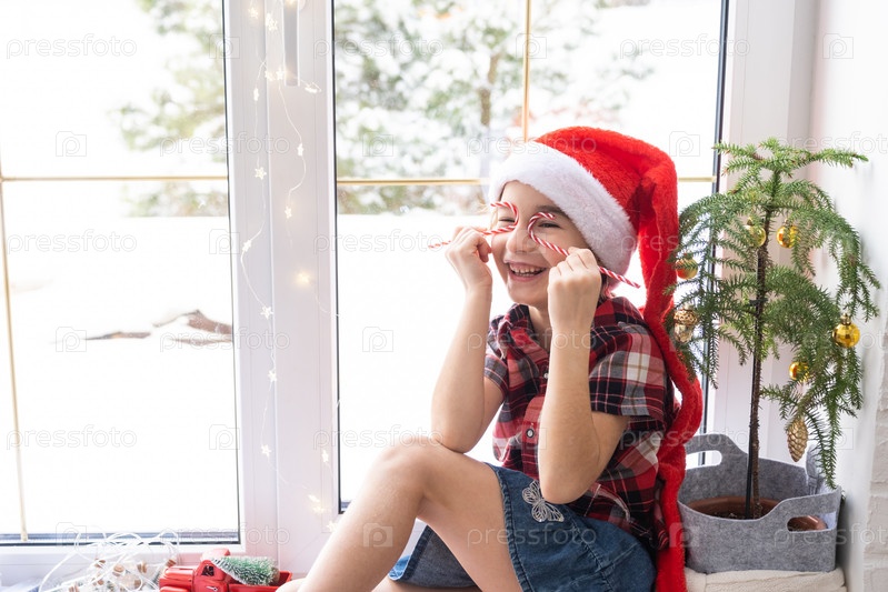 Девушка в шапке Санты сидит на подоконнике дома возле рождественской елки и прикладывает леденец к глазам, как очки. Ребенок веселится и корчит рожицы, ожидая Рождества и Нового года