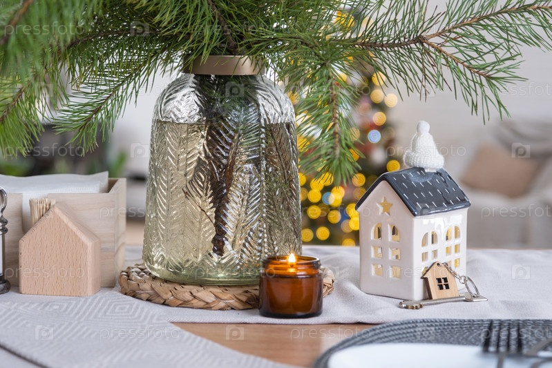 Ключ от дома в уютном доме с рождественским декором на столе праздничной кухни. Подарок на Новый год. Строительство, дизайн, проект, переезд в новый дом, ипотека, аренда и покупка недвижимости