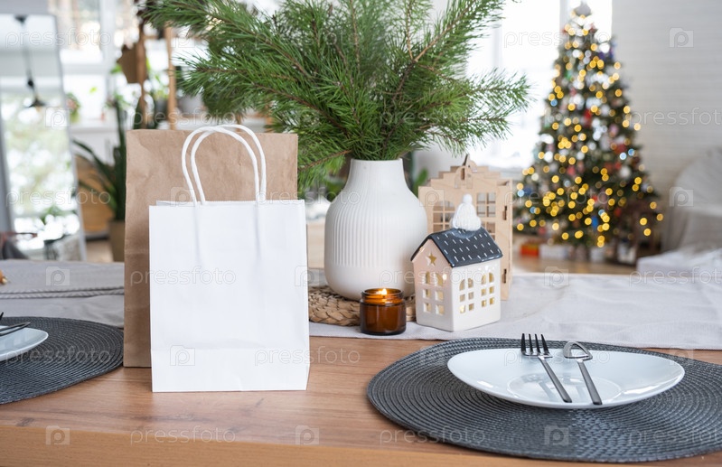 Макет бумажных пакетов стоит на кухонном столе, украшенном к Рождеству. Покупки и подарки, подарки и готовые блюда доставлены и приготовлены к Новому году