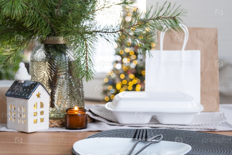 Контейнеры службы доставки еды на столе в белой кухне, празднично поданные для празднования Рождества и Нового года. Экономия времени, горячий заказ, одноразовая пластиковая коробка, ремесленная упаковка. макет