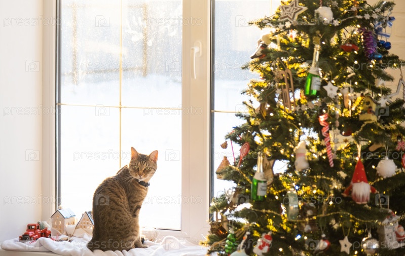 Кошка сидит на подоконнике в гирлянде елочной гирлянды. Рождество, Новый год. Праздничное уютное настроение, снег за окном, холода