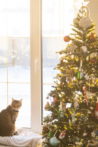Кошка сидит на подоконнике в гирлянде елочной гирлянды. Рождество, Новый год. Праздничное уютное настроение, снег за окном, холода