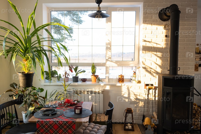 Солнечный интерьер дома в стиле лофт с растениями в горшках, большим окном, накрытым столом на рождественские и новогодние праздники