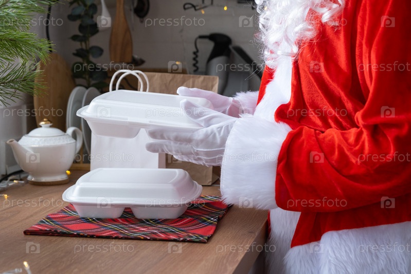 Доставка еды в контейнеры для обслуживания на дому в руках Санта-Клауса кладет ее на кухонный стол и забирает. Готовый горячий заказ, питание на новогодние и рождественские праздники