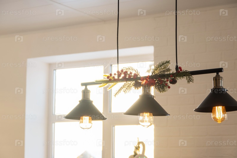 Черный абажур в индустриальном стиле лофт украшен еловыми ветками к Рождеству и Новому году на фоне белой кирпичной стены. Крупный план, минимализм