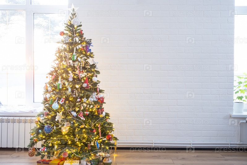 Рождественская елка в белом интерьере дома с большими окнами. Светящиеся гирлянды гирлянд в интерьере студии. Комнатные растения в доме