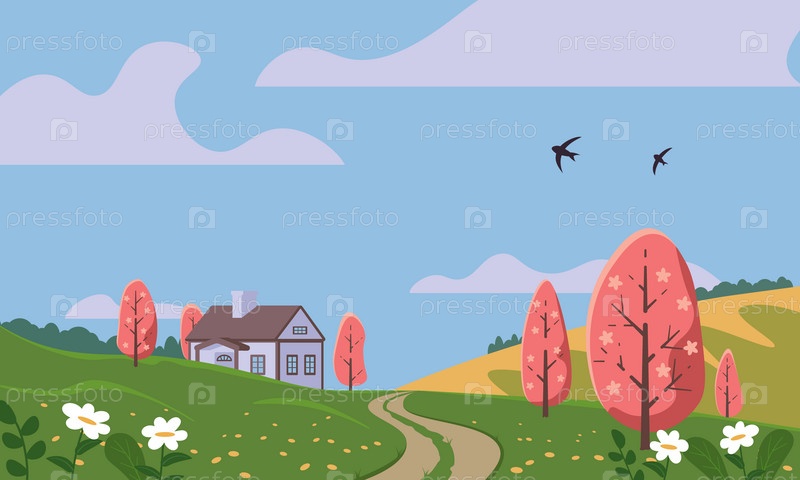 Весенний пейзаж, сельская местность. Поле, холмы, цветущие деревья и дом. Деревенский пейзаж