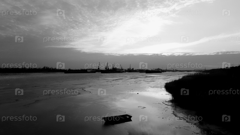 Лед рядом с портом. Доки около города. Баржи во льду. Река зимой. Лед тает весной