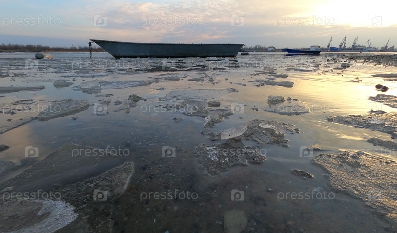 Льдины на реке. Лодка в закате. Сумерки на пляже
