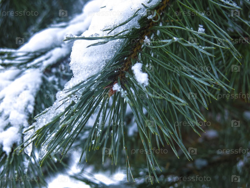 Заснеженные ветки сосны с длинными иголками зимой