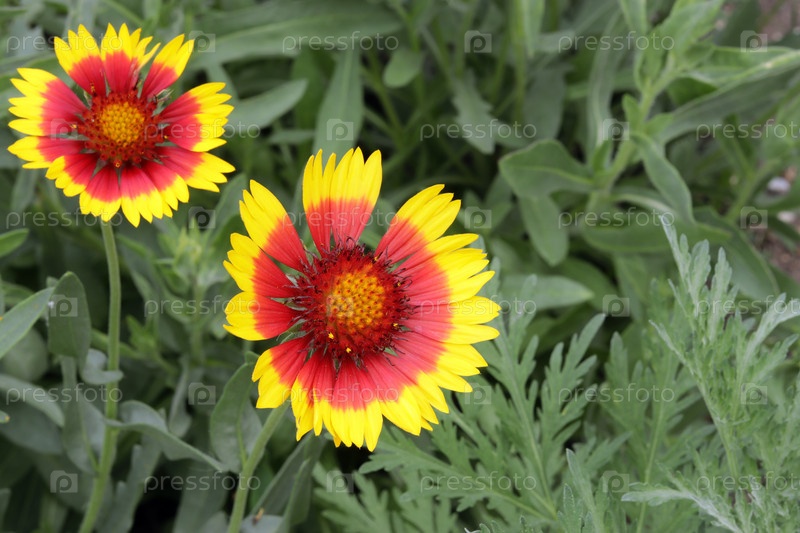 Яркий желто-красный цветок гайлардии на фоне зеленой травы