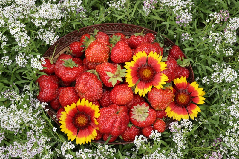 Клубника в пластиковой емкости на фоне белых цветов алиссума