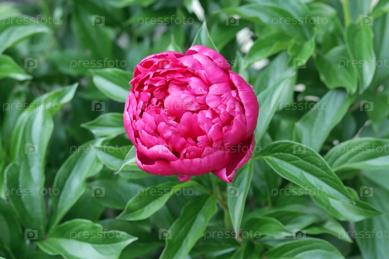 Красный цветок пиона на фоне яркой зелени