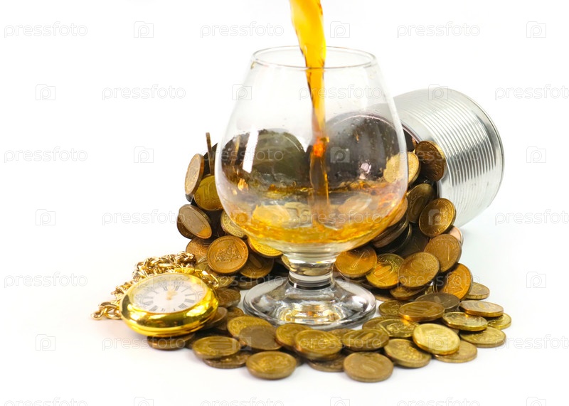 Стакан крепкого алкогольного напитка в куче монет и старых рождественских часах