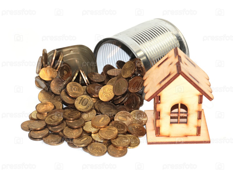 Куча русских монет лежит в металлической консервной банке рядом с деревянным домом в качестве ипотечного кредитования