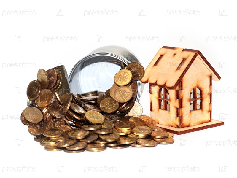 Куча русских монет лежит в металлической консервной банке рядом с деревянным домом в качестве ипотечного кредитования