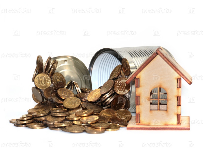 Куча русских монет лежит в металлической консервной банке рядом с деревянным домом в качестве ипотечного кредитования
