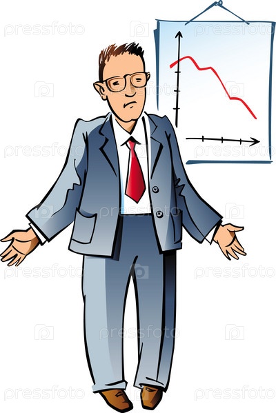 Растерянный бизнесмен в строгом деловом костюме и в галстуке демонстрирует плакат с графиком с падающей кривой, цветной вариант