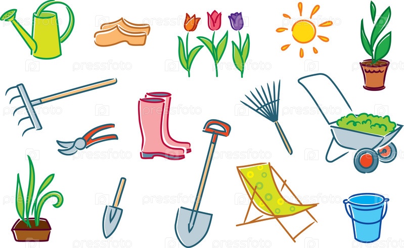 Весенний огородный набор пиктограмм: садовые инструменты, растения и прочее