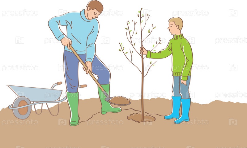 Взрослый мужчина и мальчик сажают дерево ранней весной