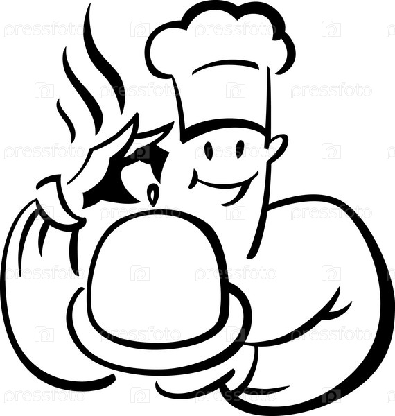 Повар несет горячее готовое блюдо под крышкой, черно-белый линейный вариант