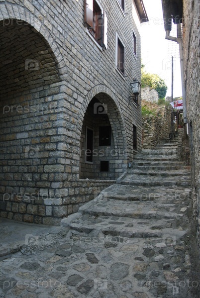 Вид на узкую улицу в старом районе. Будва, Черногория. Очень посещаемое туристами место