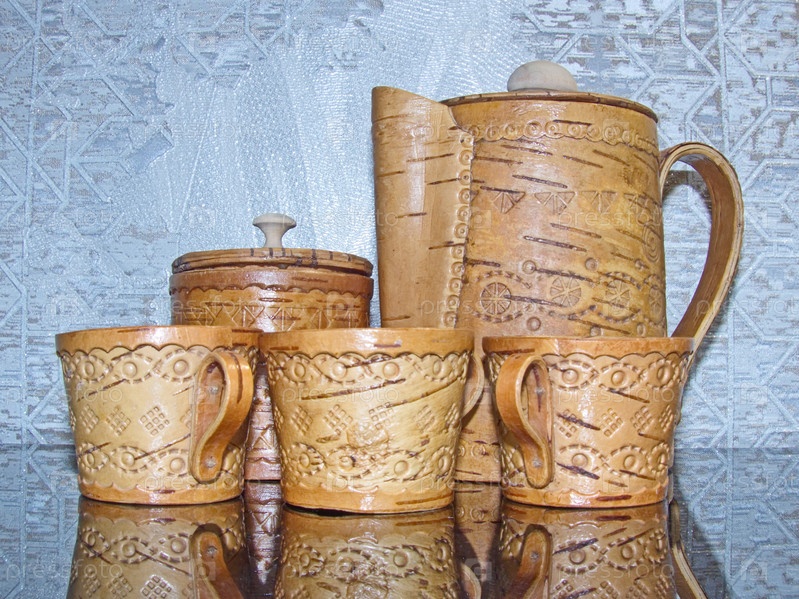 Чашки, чайник, сахарница из бересты. Кухонные принадлежности. Народные промыслы России. Ретро. Изделия из бересты изготавливались большинством обществ задолго до того, как была изобретена керамика