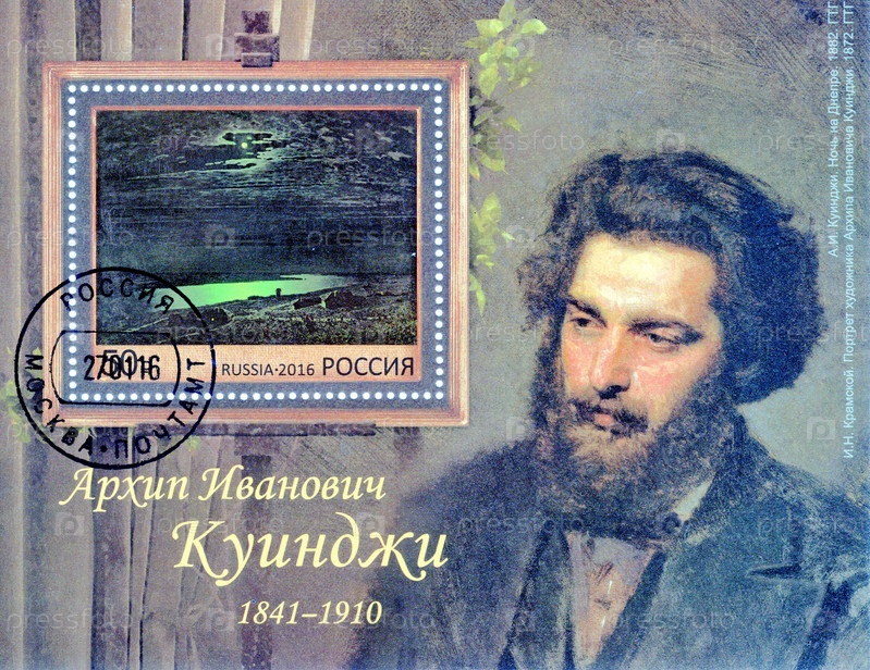 Россия, около 2016 г: Крупноформатная почтовая марка в блоке с изображением русского художника Архипа Куинджи (1841-1910), мастера пейзажной живописи