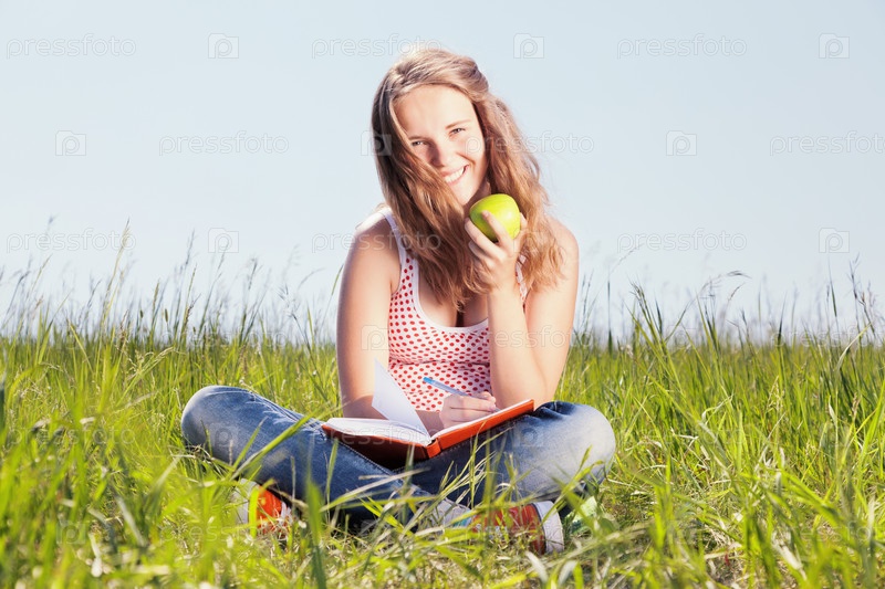 Девушка сидит на траве и ест зеленое яблоко, девушка с яблоком