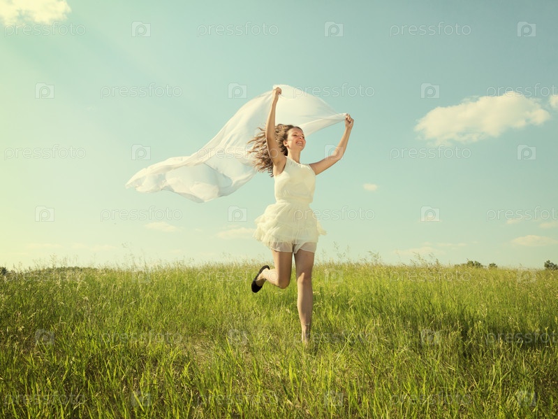 Молодая красивая девушка в белом платье наслаждается ветром, солнцем