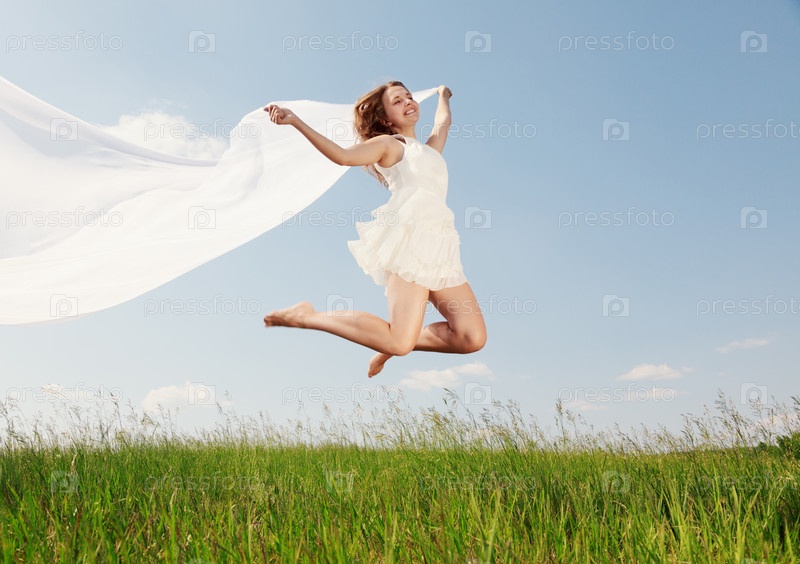Весенняя девочка, девушка прыгает по зеленой траве