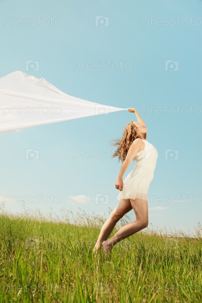Молодая красивая девушка в белом платье наслаждается ветром, весенней девушкой