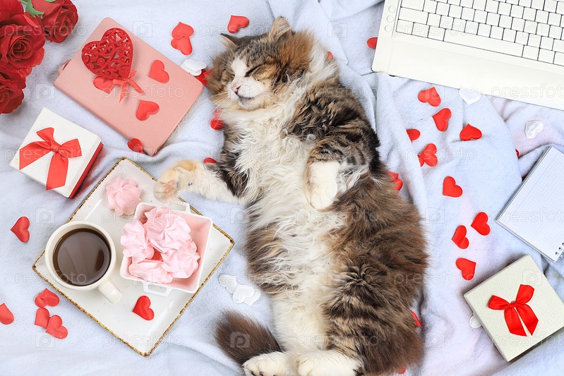 Концепция ко Дню святого Валентина или Женскому дню, Дню матери, баннеру. Забавный спящий кот, букет роз, чай, сердечки и зефир на светлом фоне, поздравления любимой с праздником, днем рождения, выборочный фокус