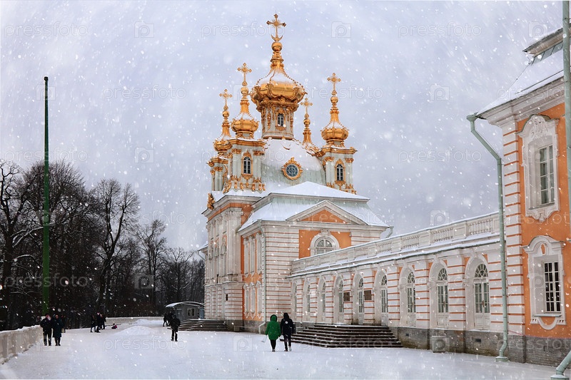 Россия, Санкт-Петербург, Петергоф, 21 февраля 2018 года. На фото главный придворный храм в Верхнем парке Государственного музея-заповедника "Петергоф" и люди, гуляющие в парке и любующиеся архитектурой