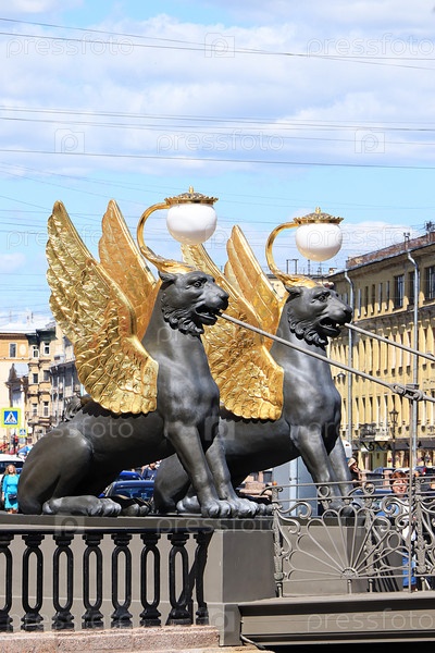 Россия, Петербург, 29 июня 2019 г. Крылатые львы на Банковском мосту. Грифоны на Банковском мосту на реке Фонтанке, по легенде, охраняют золотые сокровища, а кто к ним прикоснется, тот разбогатеет