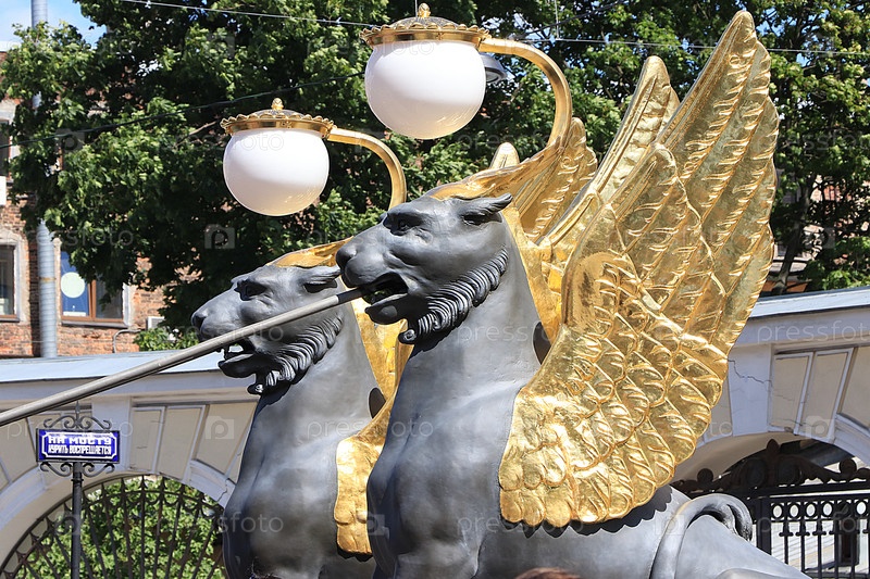 Россия, Петербург, 29 июня 2019 г. Крылатые львы на Банковском мосту. Грифоны на Банковском мосту на реке Фонтанке, по легенде, охраняют золотые сокровища, а кто к ним прикоснется, тот разбогатеет