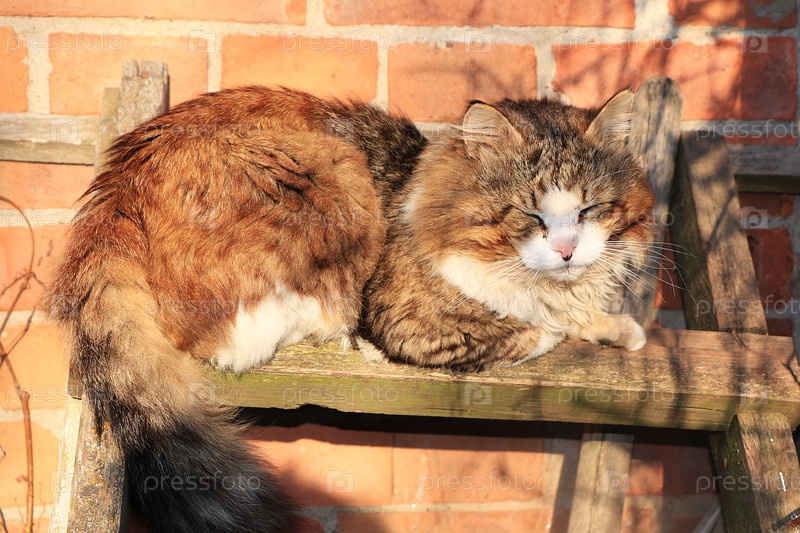Деревенский кот на заборе греется в лучах заходящего солнца. Вечер в русской деревне тихий и уютный. Спящая кошка на лестнице в саду