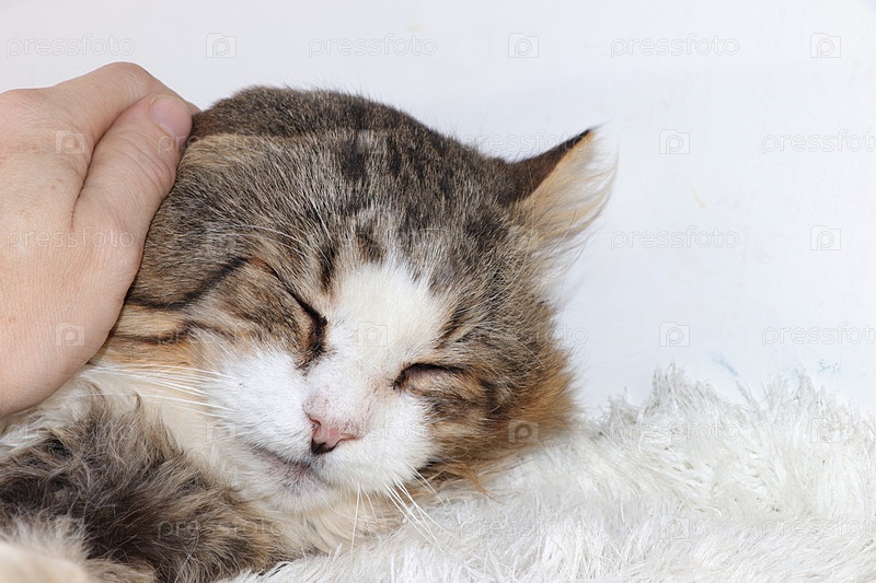 Крупный план спящего кота на мужской руке, уютный дворовой кот нашел свой дом, концепция дружбы и любви к домашним животным, избирательный фокус