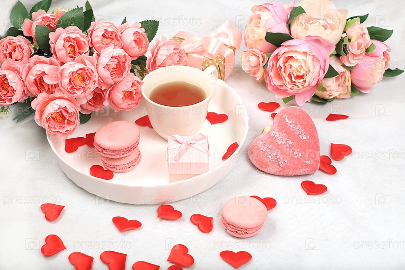 Концепция ко Дню святого Валентина или Женскому дню, Дню матери, баннеру. Поздравительная открытка, розовые розы, чай и сердечки и зефир на светлом фоне, поздравления с праздником, днем рождения, выборочный фокус