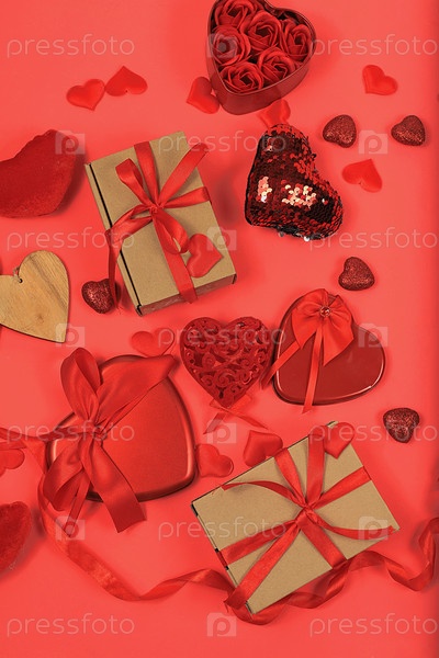 Концепция ко Дню святого Валентина или Женскому дню, баннер. Поздравительная открытка, сердечки и подарочные коробки на красном фоне, место для текста, поздравления с праздником, днем рождения, выборочный фокус