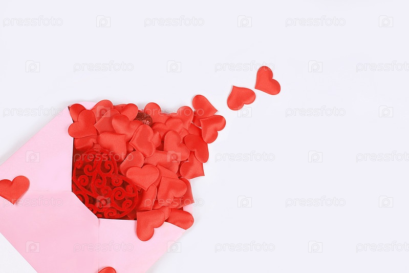 Концепция ко Дню святого Валентина или Женскому дню, баннер. Поздравительная открытка, сердечки в конверте на светлом фоне, место для текста, поздравления с праздником, днем рождения, выборочный фокус