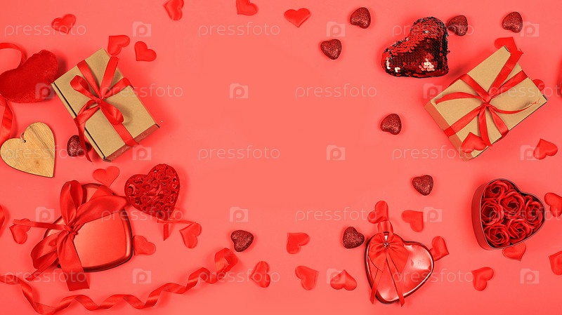 Концепция ко Дню святого Валентина или Женскому дню, баннер. Поздравительная открытка, сердечки и подарочные коробки на красном фоне, место для текста, поздравления с праздником, днем рождения, выборочный фокус