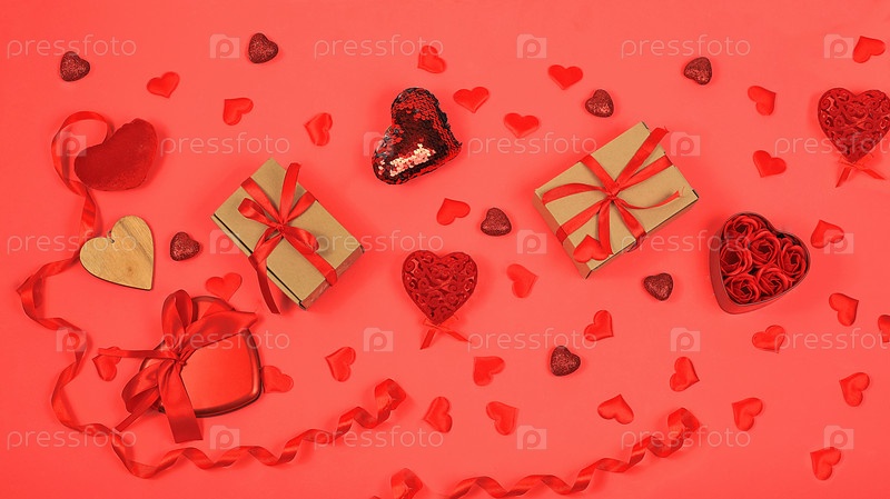 Концепция ко Дню святого Валентина или Женскому дню, баннер. Поздравительная открытка, сердечки и подарочные коробки на красном фоне, место для текста, поздравления с праздником, днем рождения, выборочный фокус