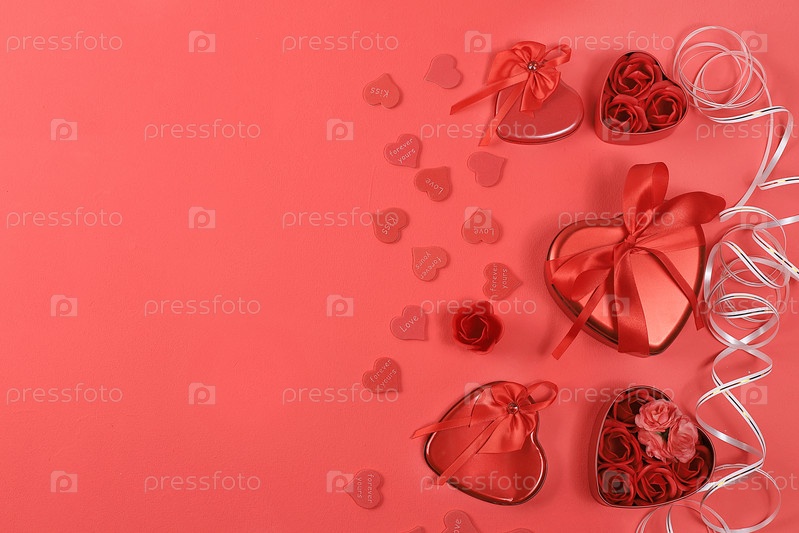 Концепция Дня святого Валентина или Женского дня. Поздравительная открытка, красные сердечки и подарочные коробки на розовом фоне, место для текста, баннер, счастливых праздников, поздравления, день рождения, выборочный фокус