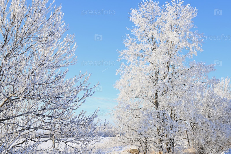 После снегопада ветки деревьев покрываются снегом и сверкают на солнце, в сильный мороз и низкие температуры. Русская природа зимой, Рождественский фон. Это красивое зимнее знамя, новогодняя открытка,